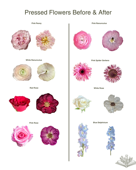 Take a look at our comparison table showing the flowers before and after pressing.